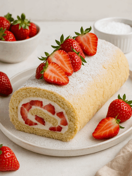 Vegane Biskuitrolle mit Erdbeer-Sahne-Füllung – einfaches Rezept für eine fluffige Erdbeerrolle
